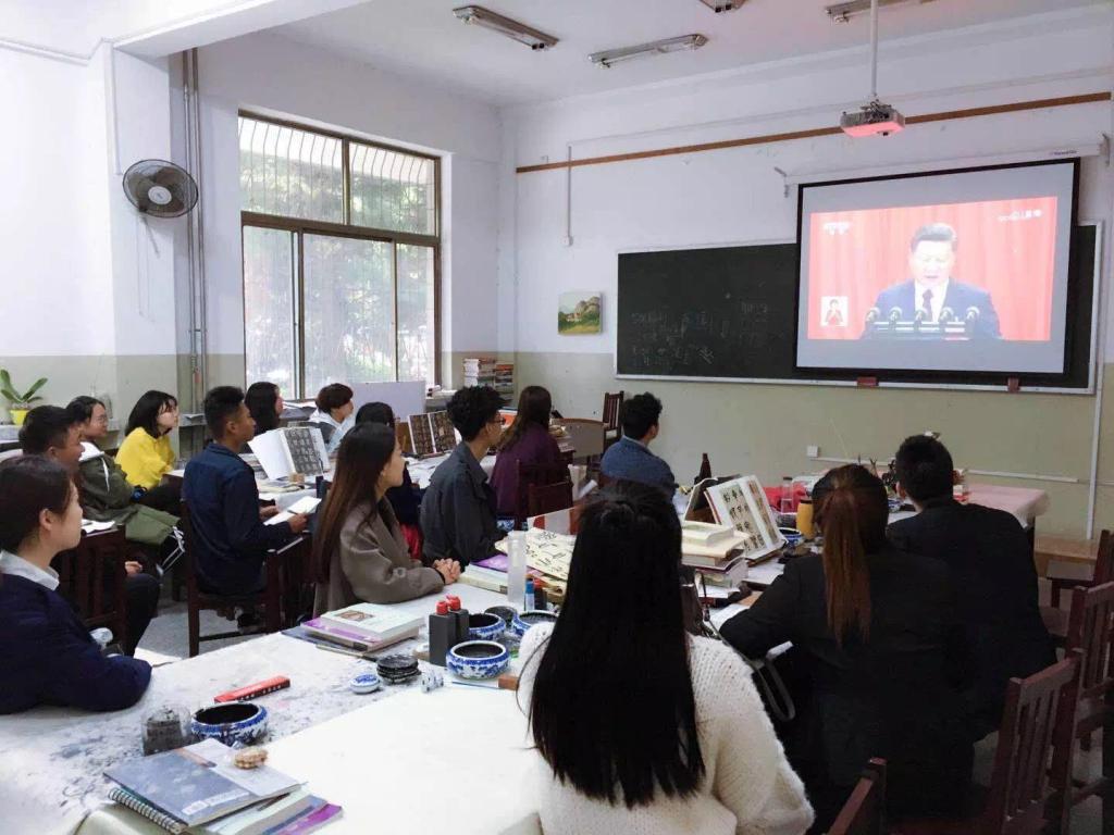 在会议室和1107教室分别组织教工党员、学生党员、入党积极分子和学生干部等班级骨干观看直播盛况,集体学习习近平总书记所作报告。