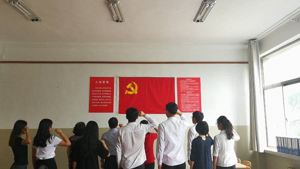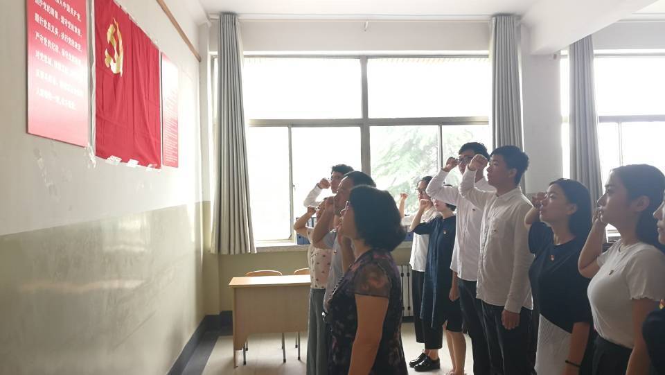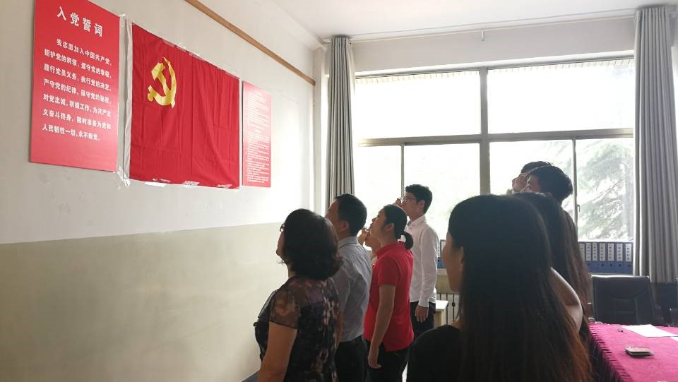 学生党支部全体党员在支部书记史萌老师的带领下,面对党旗,重温入党誓词,庄严宣誓。