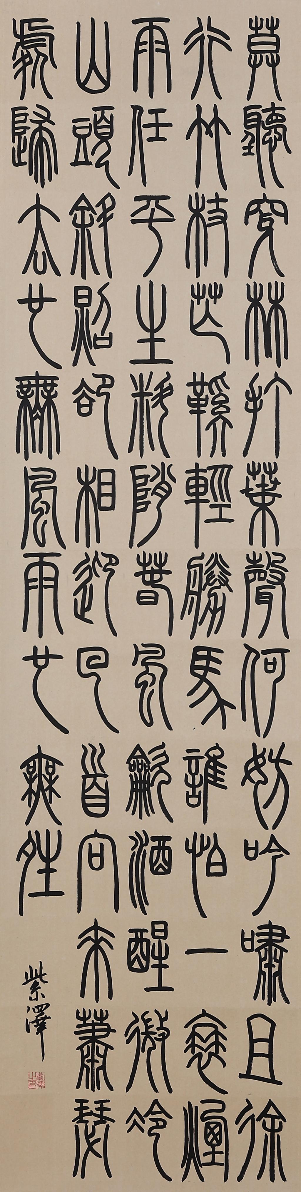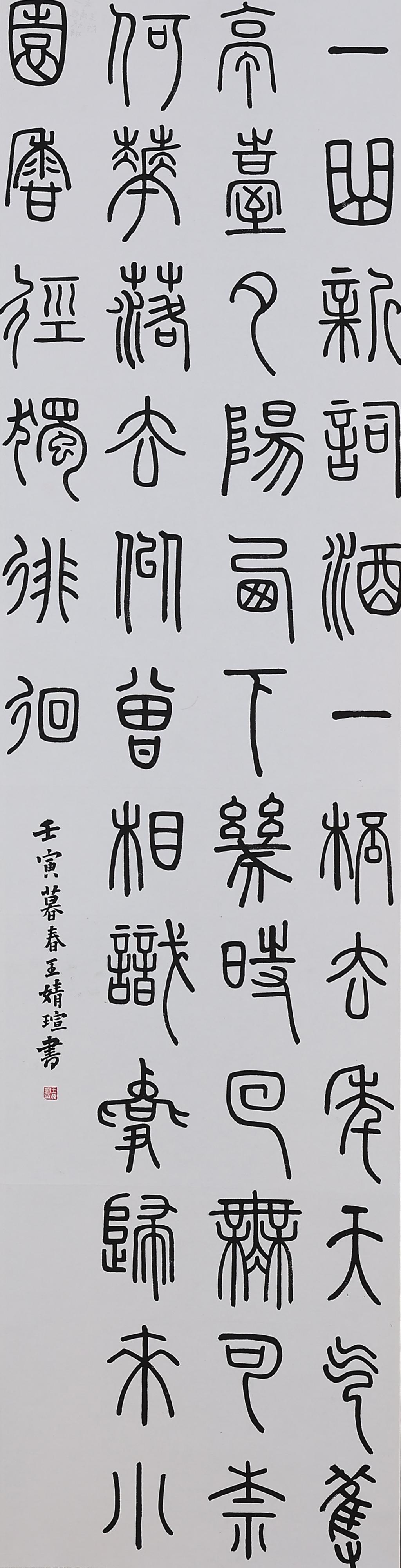 The calligraphy is in seal script and derived from an article of Tang literatus Liu Yuxi.The author who wrote it expressed his spirits of dwelling in modest lifestyle and being secluded from the busy world.