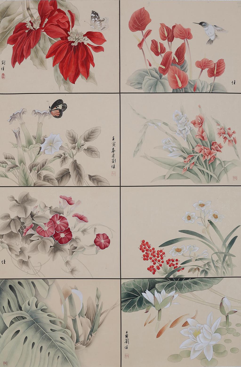 The painting is in the style of a brush painting, each measuring 34*45cm, making eight panels in total. The colour palette is bright and vibrant, and the paintings are simple and interesting, depicting mostly flowers and plants, as well as insects and birds and other creatures.