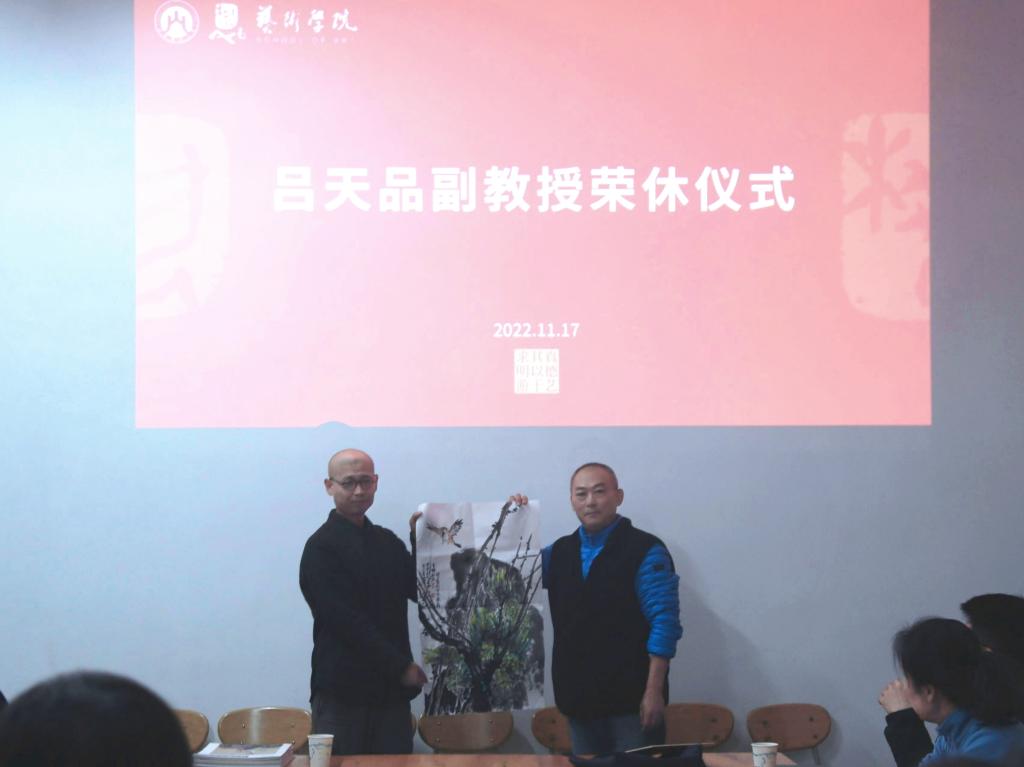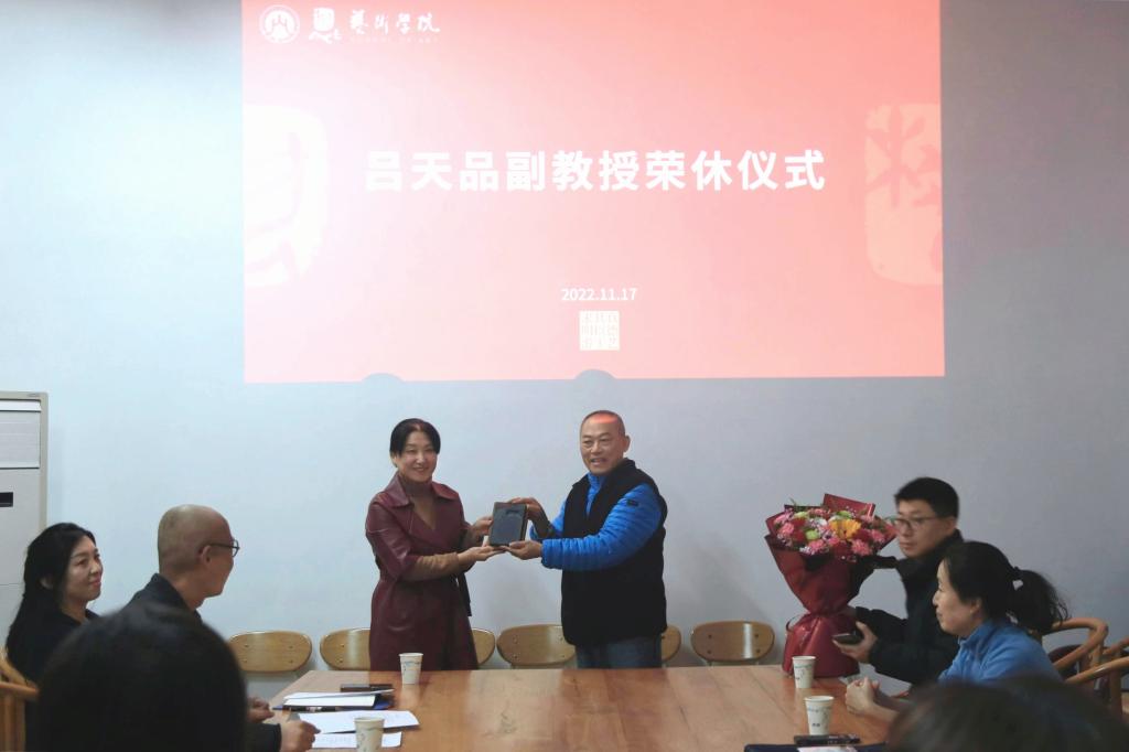 宋述林副院长介绍了吕天品副教授从事教育工作特别是调入我校以来的基本情况;赵连幸副书记从为人、做事、教学、创作等方面对吕天品副教授为学院做出的积极贡献进行了回顾,希望吕天品副教授退休后继续发挥余热,有所为,有所养、有所乐,健康、快乐、充实地过好颐养之年;教师代表崔敬介绍了吕天品副教授在设计系工作期间胸怀全局,无私奉献、以老带新,教书育人的突出业绩,希望他退而不休,继续关心支持青年教师的成长;学生代表向吕天品副教授献花,以全体学生的名义向老师致敬;杨扬书记向吕天品副教授赠送安徽歙砚一方作为荣休纪念品;吕天品副教授向学院赠送了精心创作的画作和精品集,感谢学院对他的培养、支持和包容,希望学院在新班子的带领下越办越好,并表示一定会继续心向学院,有机会随时准备为学院做好工作。