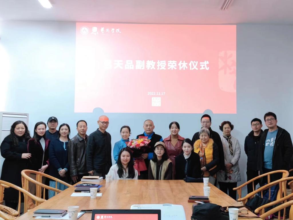 在A206会议室举行吕天品副教授荣休仪式。学院领导,各系主任,部门负责人,吕天品伉俪,设计系教师代表,学生代表参加活动,副院长(主持工作)宋述林主持仪式。
