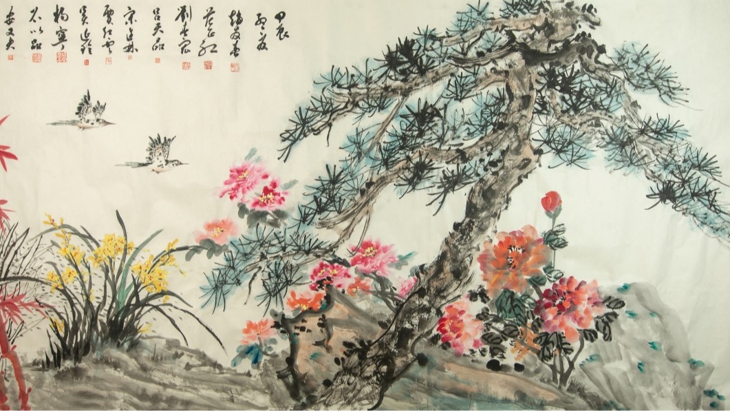 多功能厅的笔会现场,名家云集,欢声笑语,大家在欢欣鼓舞的气氛中开展精心创作,以书言志、以画寄情。近三个小时,大家不仅各显专长,创作出风格迥异的佳品力作,还融通共识,集体创作完成了八尺整张的《花开歌盛世》精品国画一幅,该作品构图以盛开的牡丹、水仙等吉祥花卉衬托遒劲傲骨的苍松,蕴含着艺术家们对新时代教育事业这一百年基业大繁荣大发展的盛情期待和对我校财经特色名校建设的美好憧憬。笔会作品精彩纷呈,主题鲜明,书法作品《坚如磐石》《大业千秋》《继往开来》《笃行致远》《凝心聚力汇共识,擘画蓝图启新程》等字字铿锵,表达了对党的坚强领导的高度认同和衷心拥护、对学校美好前景的热切期盼。国画作品《祯祥富贵图》《雨后春笋》等充分表达了艺术家们对幸福美满生活的珍视与热爱,坚守初心、接续奋斗,共同开创美好前程。