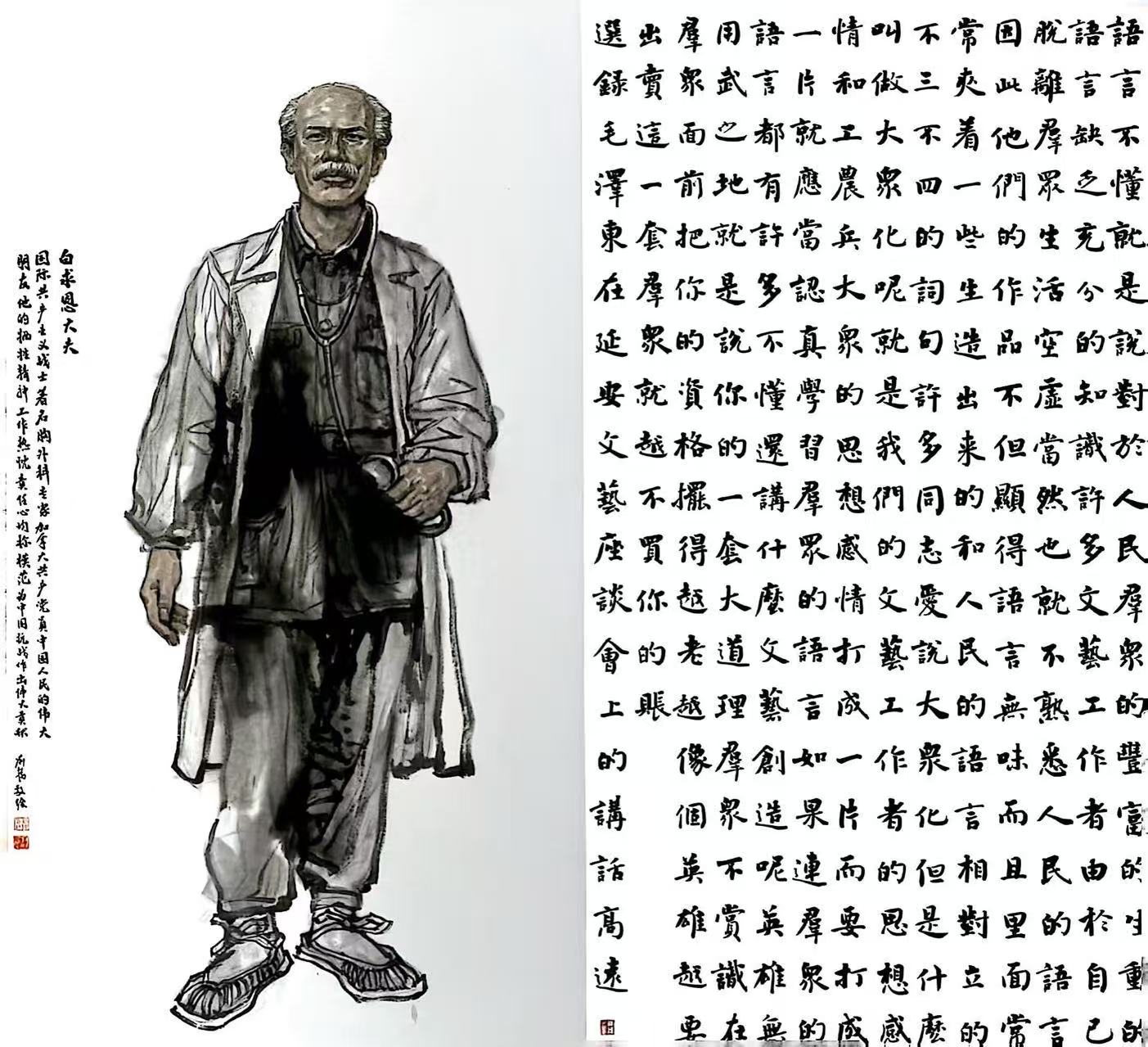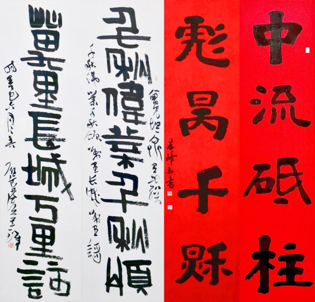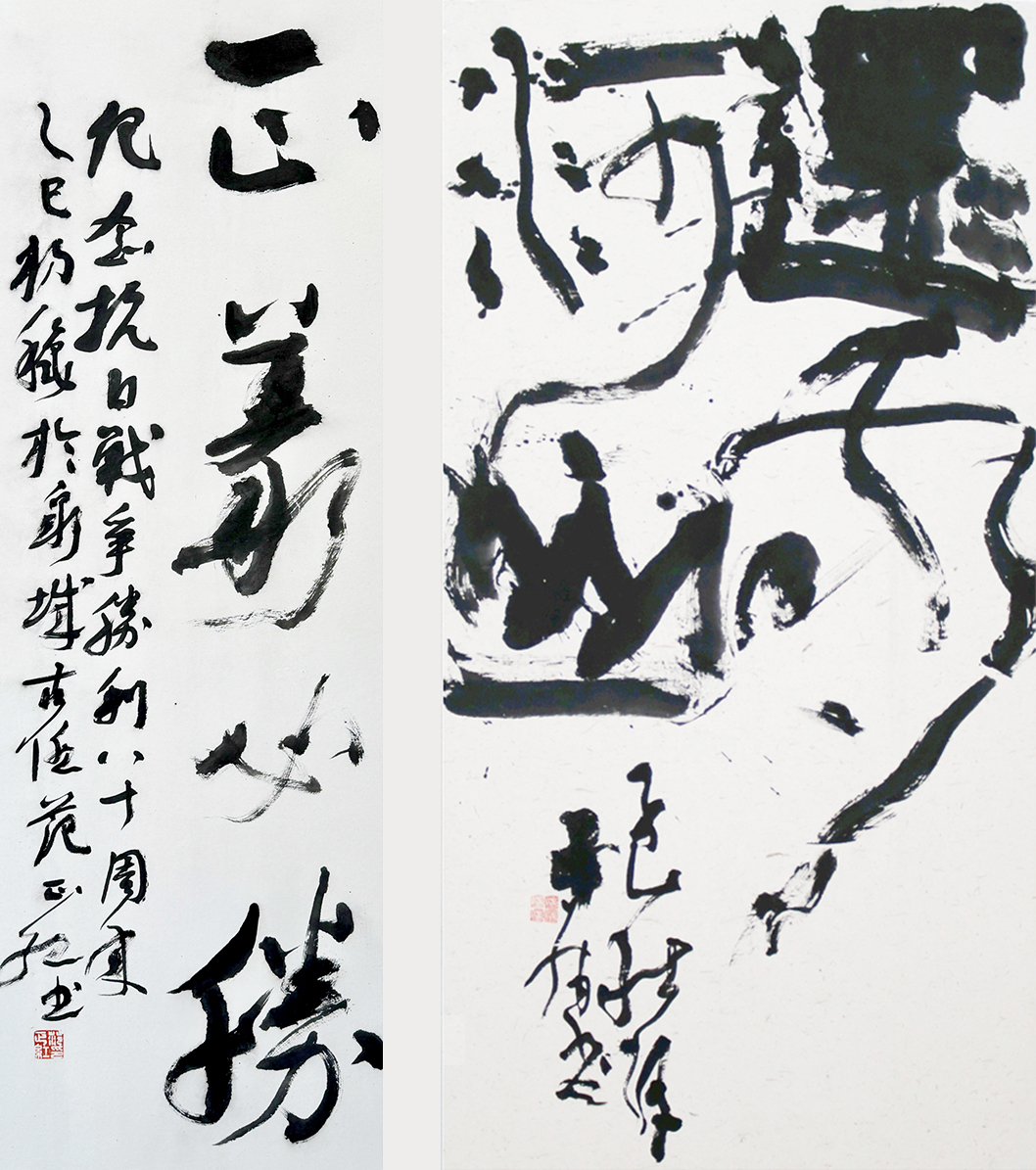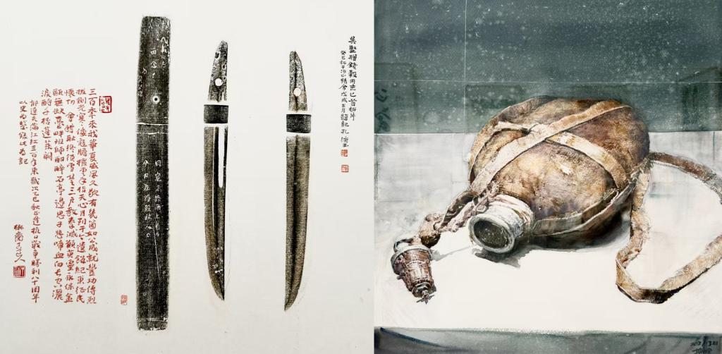 “正义必胜”“还我河山”“千秋伟业千秋颂 万里长城万里歌”“中流砥柱 彪炳千秋”等书法作品,表达了中国军民抗战必胜的信心和抗战到底的决心,表达了中国共产党是全民族抗战的中流砥柱,也是中国特色社会主义事业的坚强领导核心的强烈情感。书法《毛泽东〈在延安文艺座谈会上的讲话〉》(选录),展示了我们党在抗战时期对文艺战线的卓越领导,重温了“文艺为什么人”的问题。国画《你的名字》《游击队歌》《白求恩》等,表达了对抗战先烈和世界反法西斯统一战线的致敬。现场一幅拓片吸引了大家的注意,拓片刻印了“日寇末路用匕首,今日我得杀敌人”字样,这把我军收缴日寇的匕首,既是日寇残害中国人民的罪证,又是我军将士奋勇杀敌的明证。