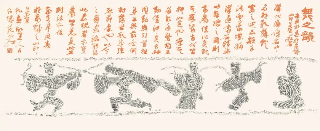 汉代画像石中多有歌舞饮宴之述,品类手法丰富,堪称汉画像石精华,此舞蹈之图则当属佳作矣。观其舞姿,步伐皆栩栩如生也,察其眉眼,手势均生动传神矣。长袖甩动与引首扭身再与最左侧对舞者形成强烈节奏也。以今之画家论,能得此表现者亦实属罕见矣。此石刻法亦佳。岁在辛丑春,于泉城之山印草堂,孔孟故里人,古任城范正红。